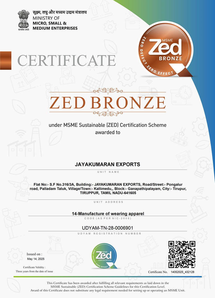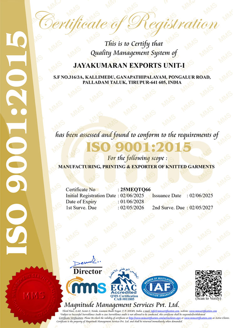 JAYAKUMARAN EXPORTS is established in 2006, is one of the leading manufacturers, exporters and suppliers of garments. We have been 100% Export oriented unit having state of art vertical set up of Garment Manufacturing Factory with Strong Ethical responsibilities and Quality Assurance